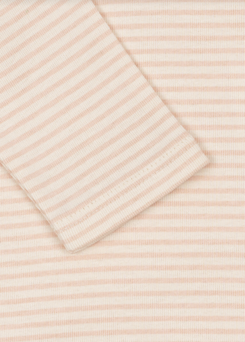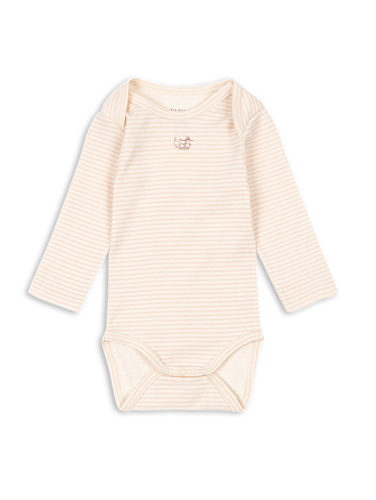 Blød bodysuit i økologisk bomuld med lange ærmer. Lavet i en fleksibel ribkant med en praktisk kuvertudskæring, der gør den nem at tage af og på, samt nemme trykknapper mellem benene til bleskift. Lavet af 100% økologisk bomuld. Dette produkt indeholder 100% OCS-certificeret bomuld, certificeret af CU1094701.