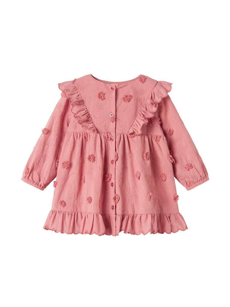 Sød langærmet kjole, med små blomster fordelt på kjolen.