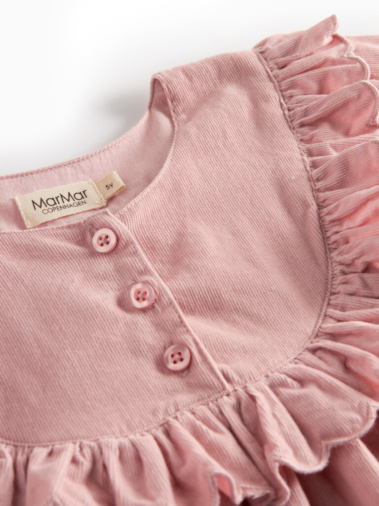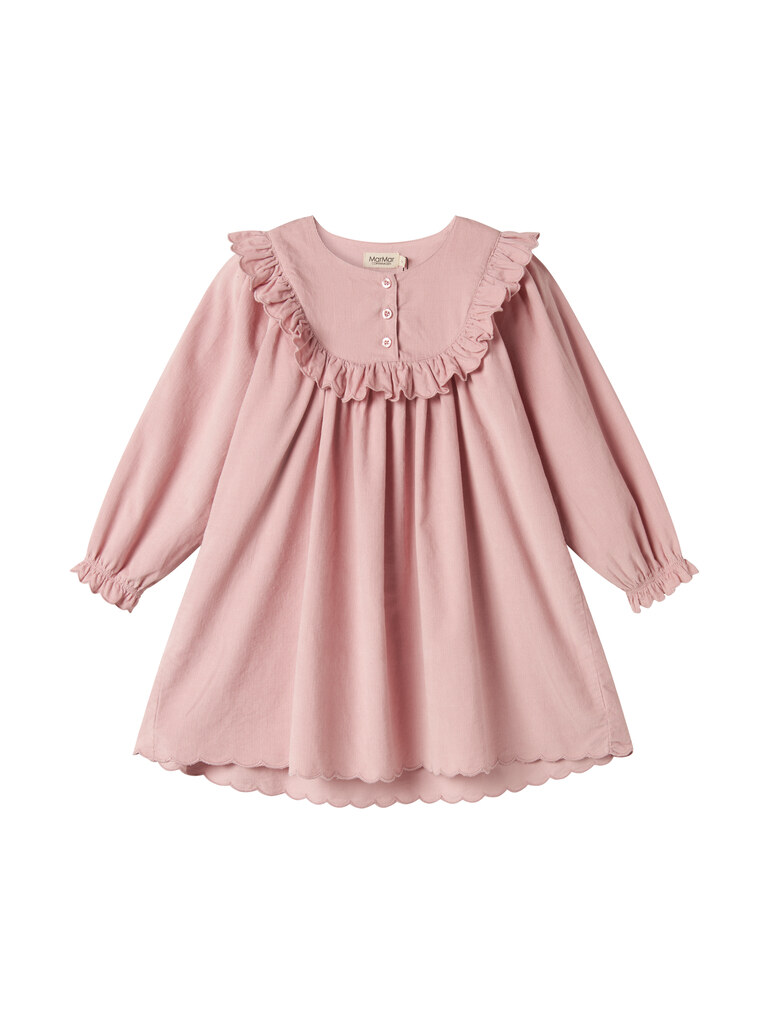 Langærmet kjole, med fint mønster i bunden af kjolen. Fin detalje omkring halsen og i enden af ærmerne.