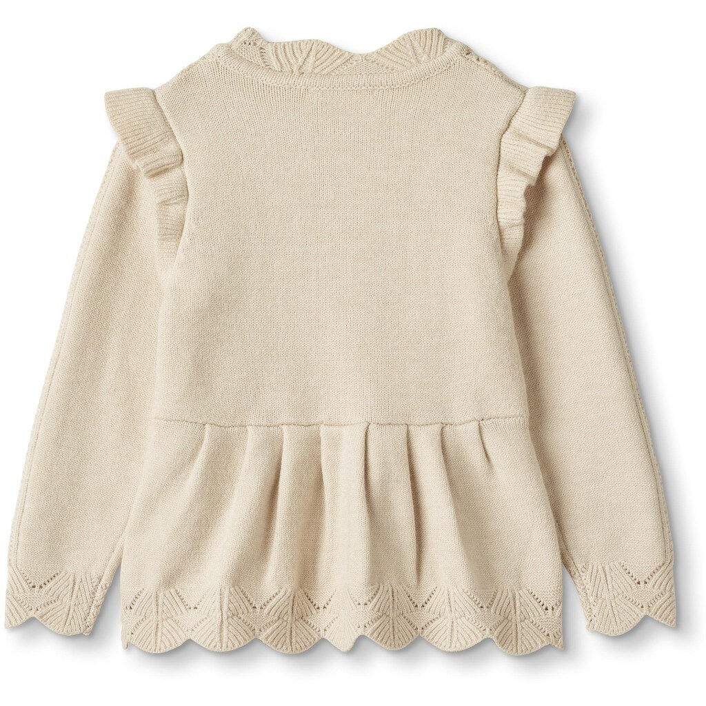 Strikket bluse i en blød kvalitet. En langærmet bluse med bølget krave og mønstrede detaljer foran, forneden og ved ærmeåbningerne.