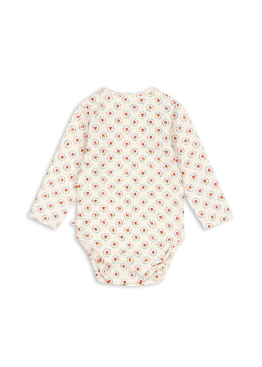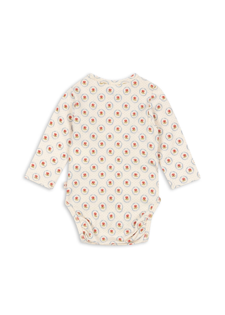 Blød langærmet wrap-body til nyfødte lavet af økologisk bomuld med et strejf af stretch for en behagelig pasform. Har trykknapper langs siderne og i skridtet, der gør det nemt at give din baby på. GOTS, Økologisk, certificeret af CU1094701