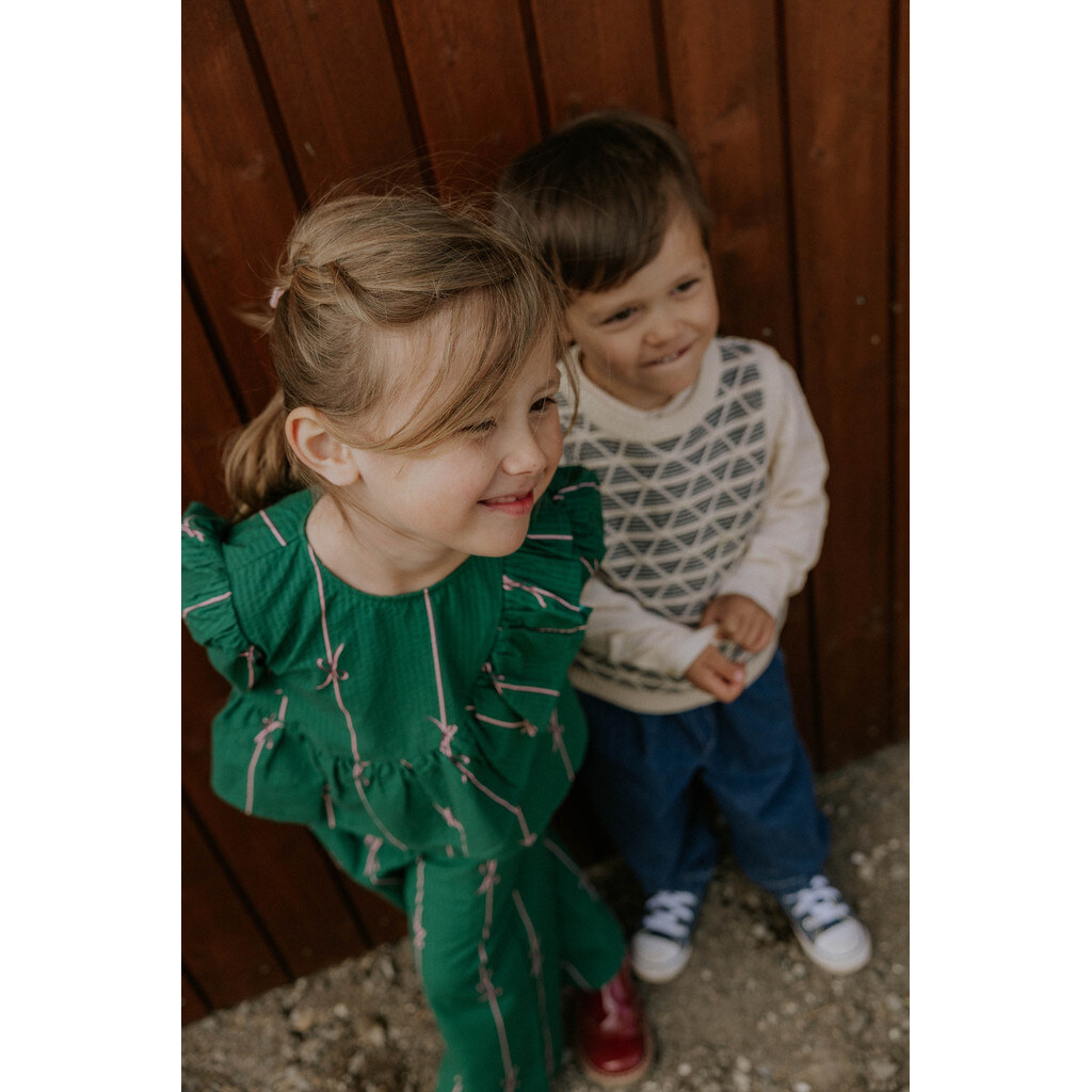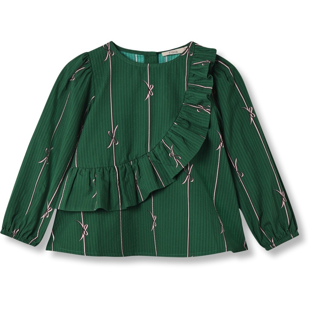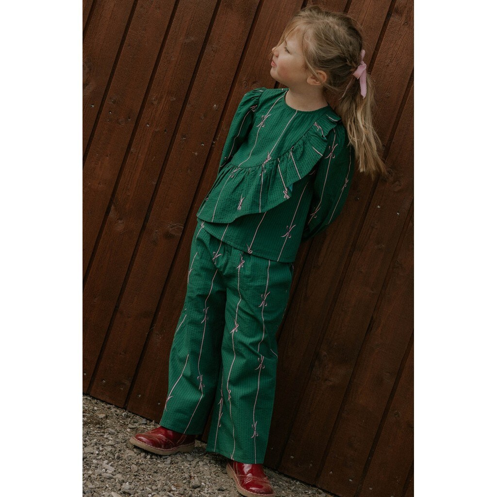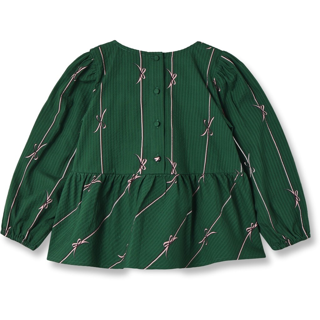 Blusen har et fint print med sløjfer i de smukkeste farver, grøn og pink.