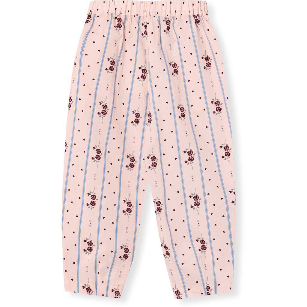 Bukser i en blød, trykt kvalitet med tekstur. Bukserne har elastisk talje og sidelommer med en flot flæsedetalje. Bukserne går til anklerne og har en løs pasform, der gør dem behagelige at have på.