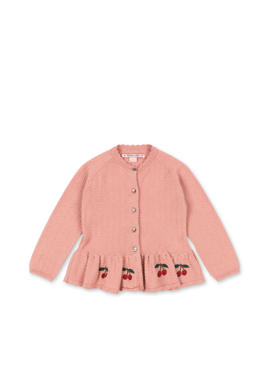 Strikket bomuldscardigan med perlemorsknapper foran. Designet med en løs peplum-silhuet og et bølget kammuslingestrikkemønster. GOTS, Økologisk, certificeret af CU1094701