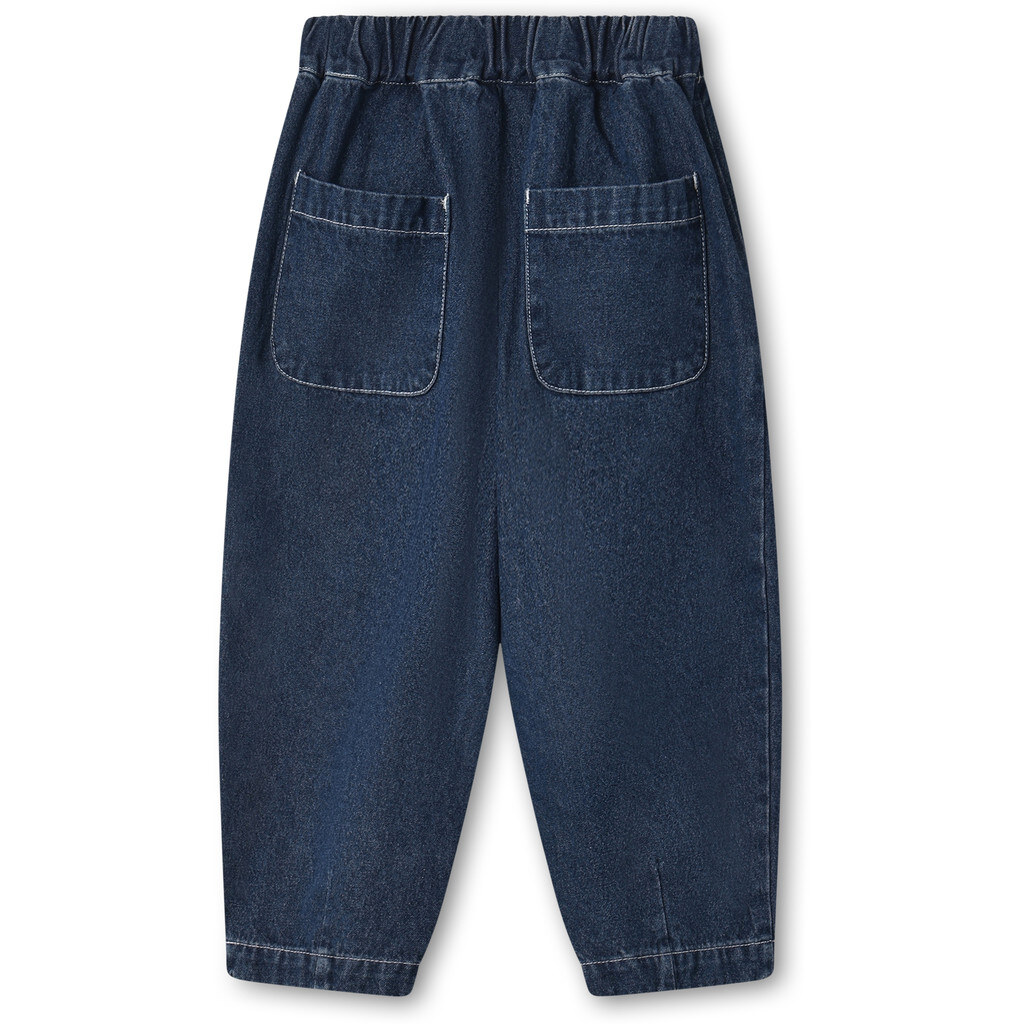 Lange denimbukser med elastisk talje og sidesømlommer, der skjuler de spændende ting, barnet finder undervejs. Bukserne har masser af volumen og et naglesnit, der gør dem behagelige at have på, men også nemme at lege i.