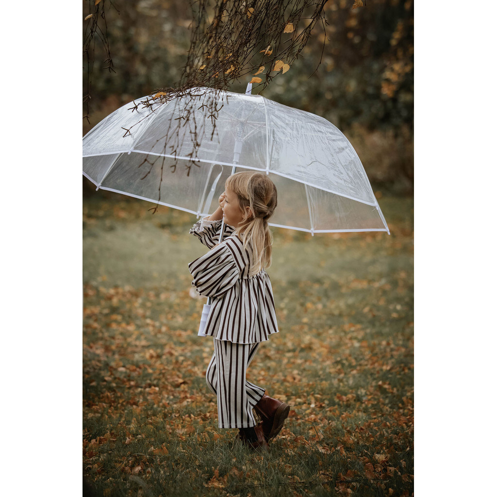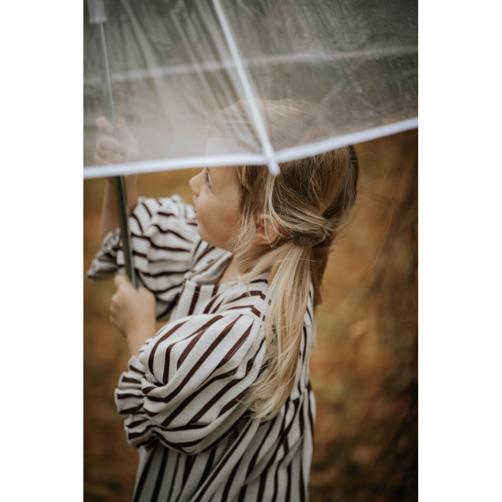 Bluse med striber og blød strikket kvalitet. Kjolen har en løs pasform med et snit ved brystet og et skørt, der tilføjer volumen. Blusen har ballonærmer med elastik i ærmet og en lille flæse forneden.