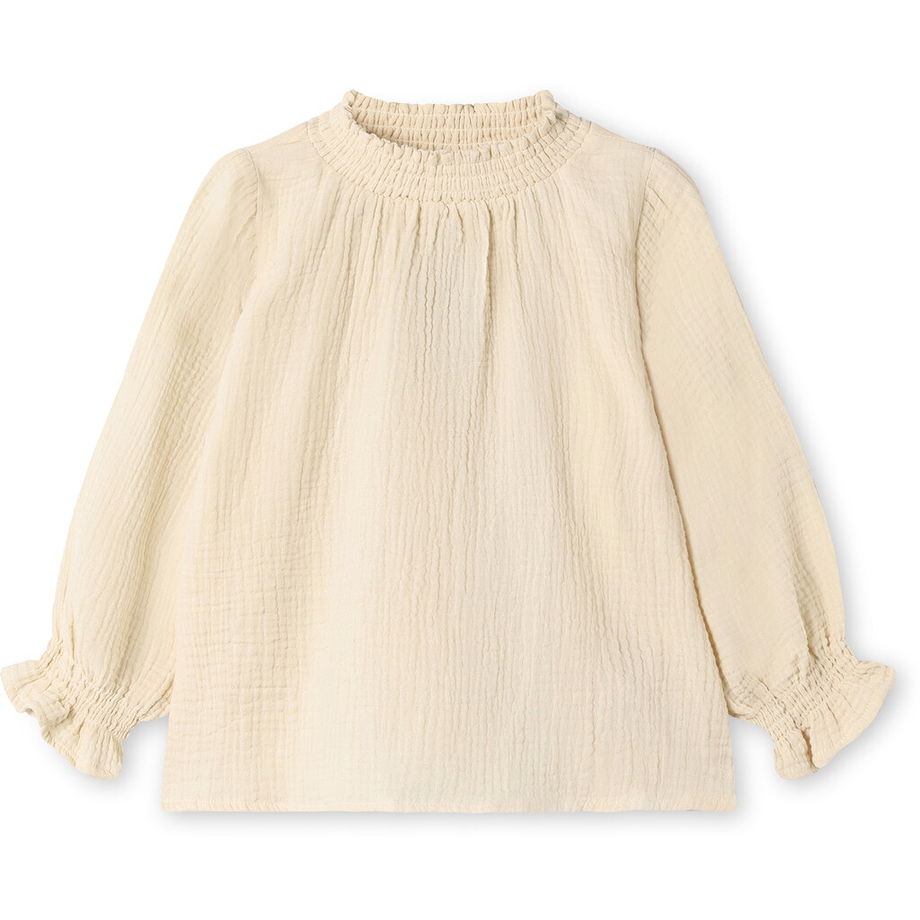 Bluse i en blød, vævet muslinkvalitet. Blusen har elastik i halsen, der giver et smukt fald, samt lange ærmer med elastik og flæse forneden. Blusen sidder dejligt løst, hvilket gør den perfekt til leg, mens den ser fin ud.