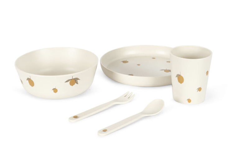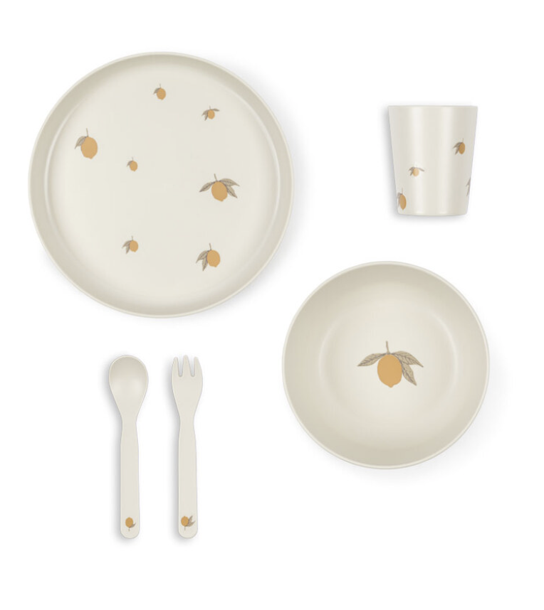 Eksklusivt dinner set i 100 % genanvendt PET. Indeholder tallerken, skål, kop og bestik til små måltider. Let, holdbart og miljøvenligt design – perfekt til hverdag, picnic og bæredygtige valg.