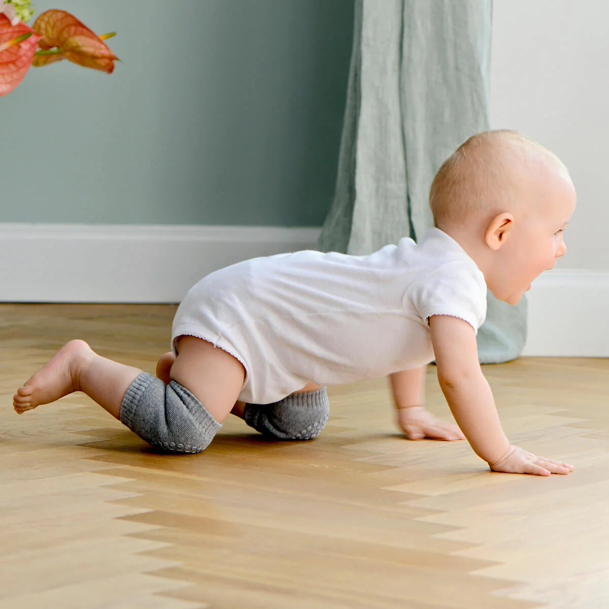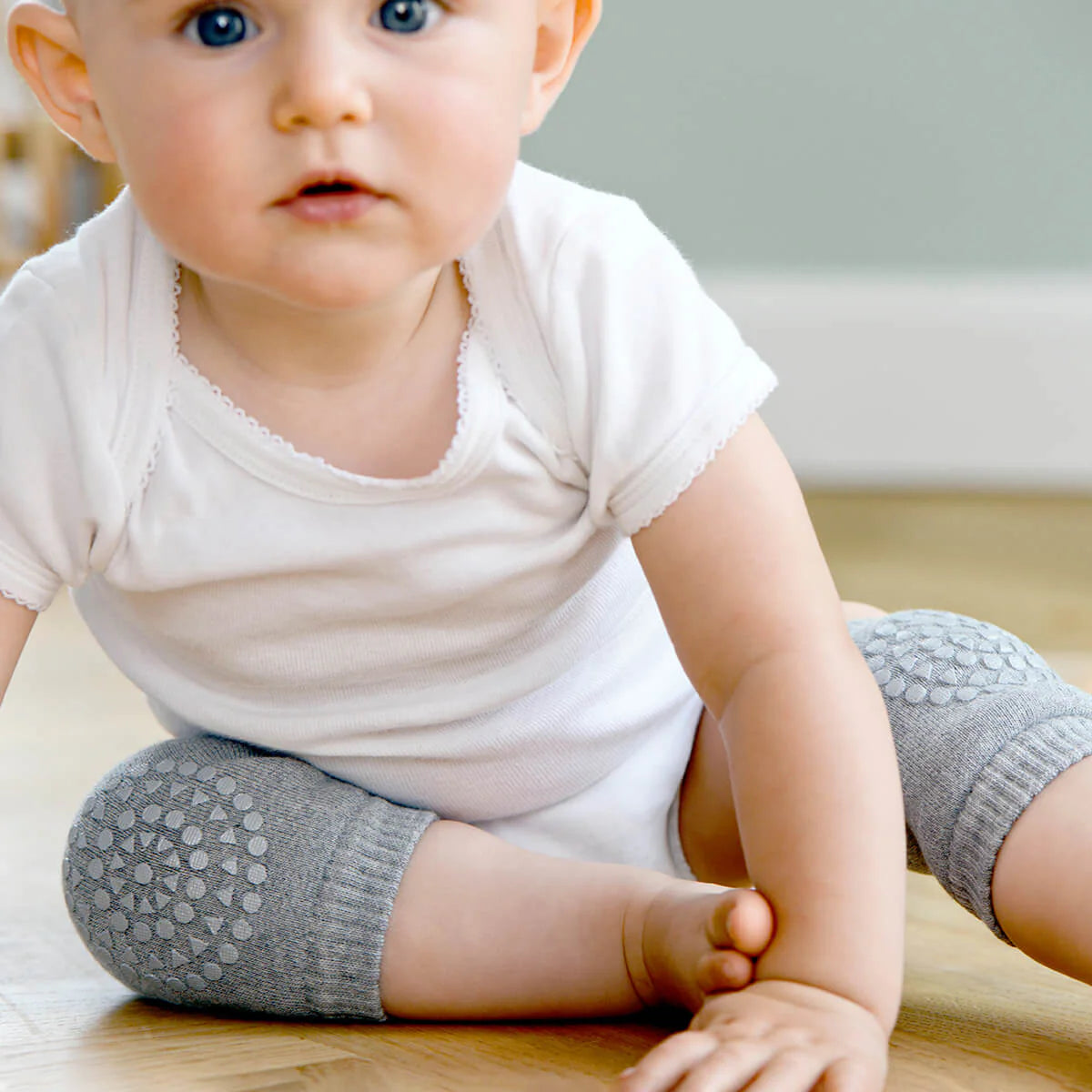"GoBabyGo skridsikre knæbeskyttere med greb til kravling. Disse knæbeskyttere er lavet af tyk økologisk bomuld og giver ekstra beskyttelse til børns knæ, mens de lærer at kravle. De skridsikre gummibeskyttere på knæene hjælper med at holde børnene stabile og forhindrer deres knæ i at glide på glatte overflader. GoBabyGo knæbeskyttere kan bruges på bare knæ eller over strømpebukser og bukser, hvilket sikrer både fleksibilitet og komfort.