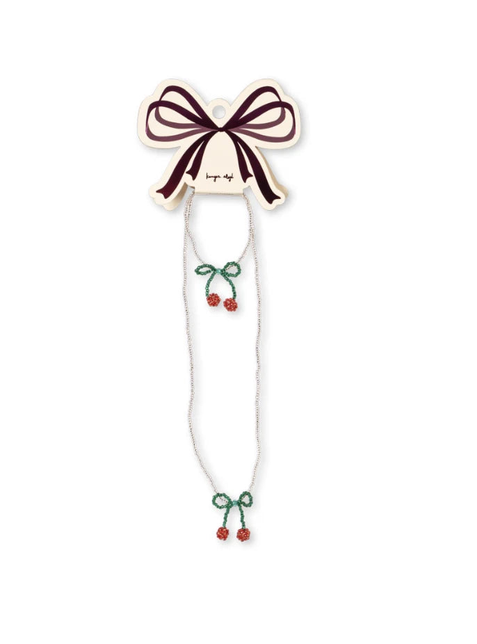 Elegant smykkesæt bestående af en perlekæde og armbånd formet som kirsebærsløjfer. Velegnet fra 3 år+ ADVARSEL! KVÆLNINGSFARE. Små dele. Lang snor. Ikke egnet til børn under 36 måneder.