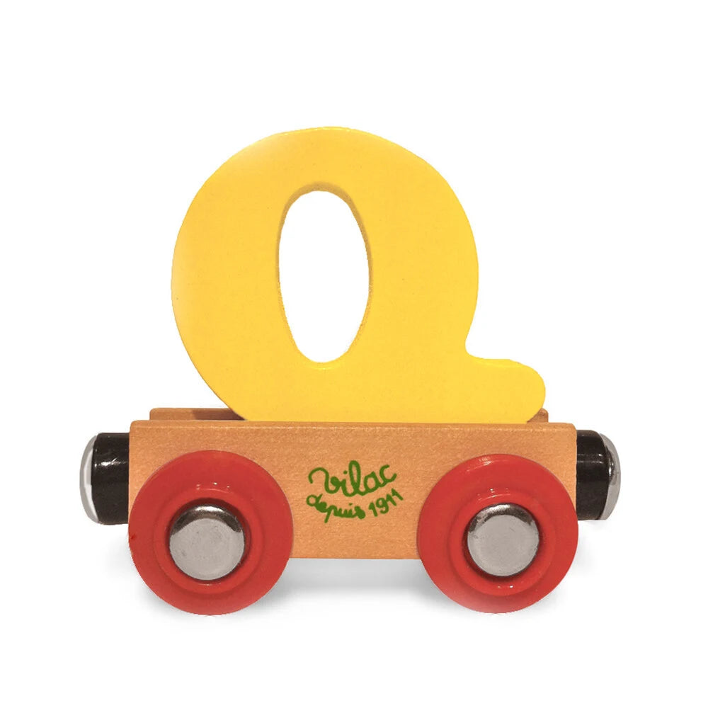 Togvogn med bogstavet Q og magnetkobling i begge ender, så den kan trækkes af Vilacs lokomotiv og sættes sammen med andre vogne til et helt alfabettog.