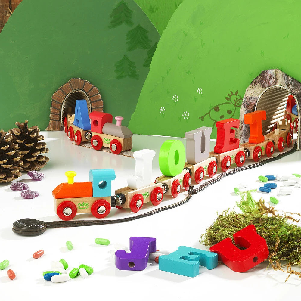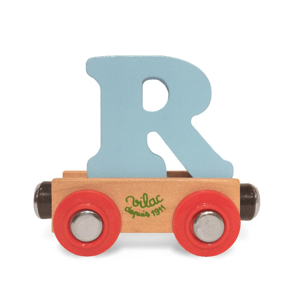 Togvogn med bogstavet R og magnetkobling i begge ender, så den kan trækkes af Vilacs lokomotiv og sættes sammen med andre vogne til et helt alfabettog.